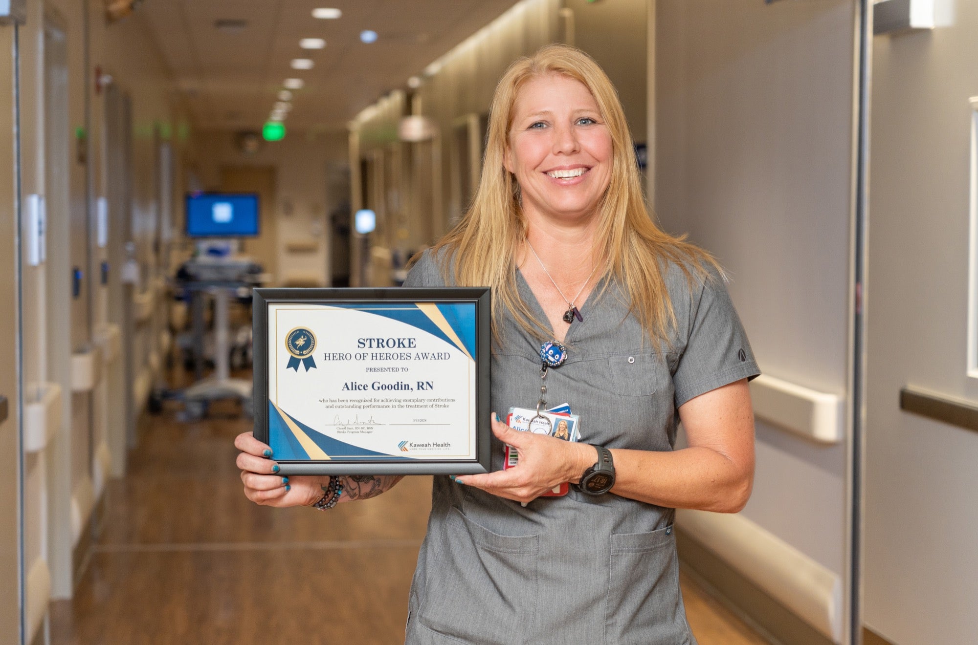 Alice Goodin, RN is being recognized as a Stroke Hero for her dedication and compassion for our stroke patients in the Emergency Department. She is a strong stroke patient advocate, ensuring we are consistently providing evidence based care. The Stroke Hero of Heroes recognition is presented to staff who have achieved exemplary contribution and outstanding performance in the care of our stroke patients.