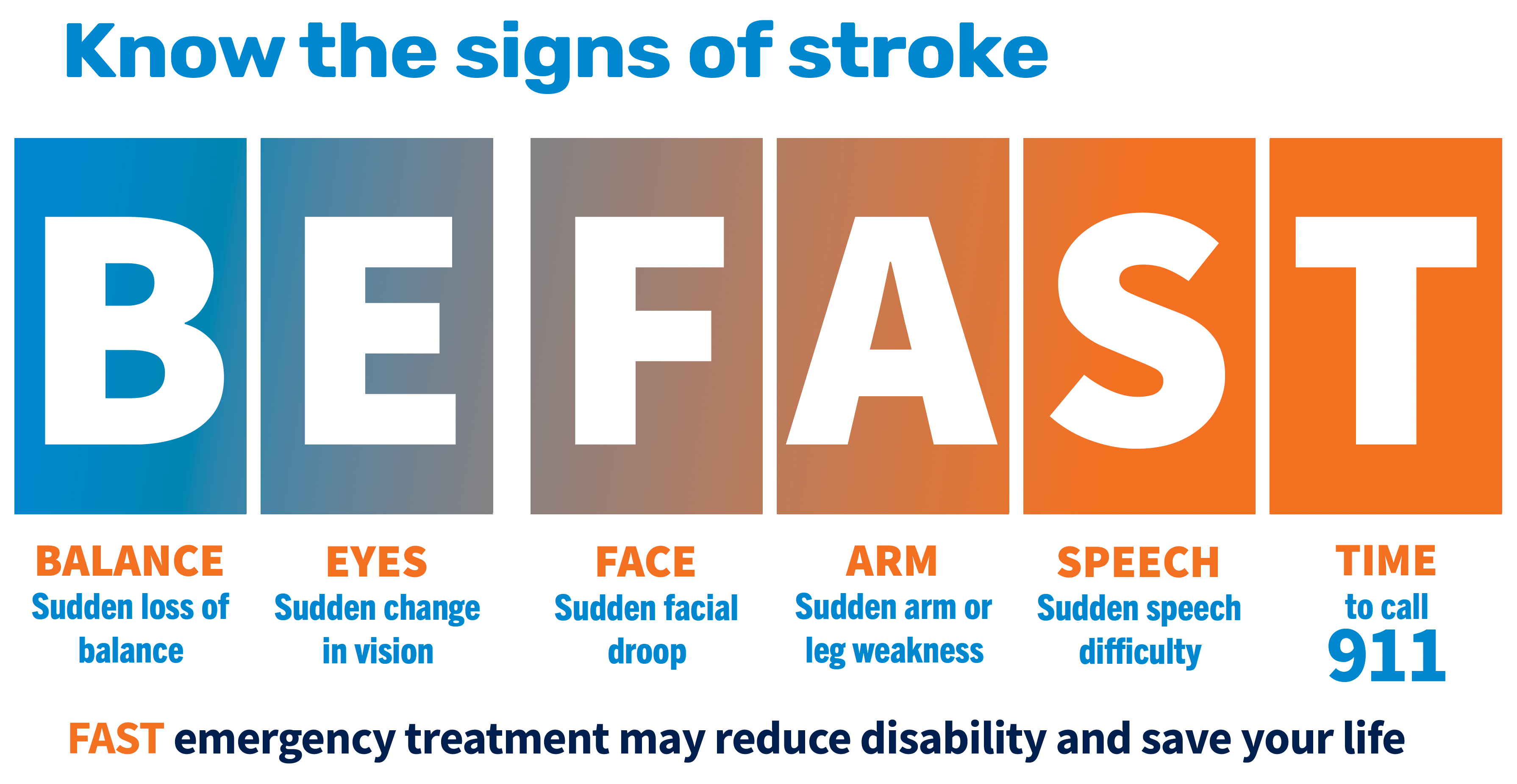 It's important to recognize stroke symptoms and go to the closest emergency department fast. An easy way to remember is what to do is the acronym BE FAST.